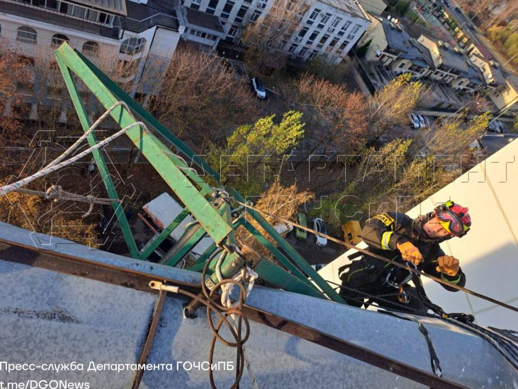 По прибытии спасатели поднялись на крышу дома и при помощи альпинистского снаряжения подняли свисающую конструкцию на кровлю здания.